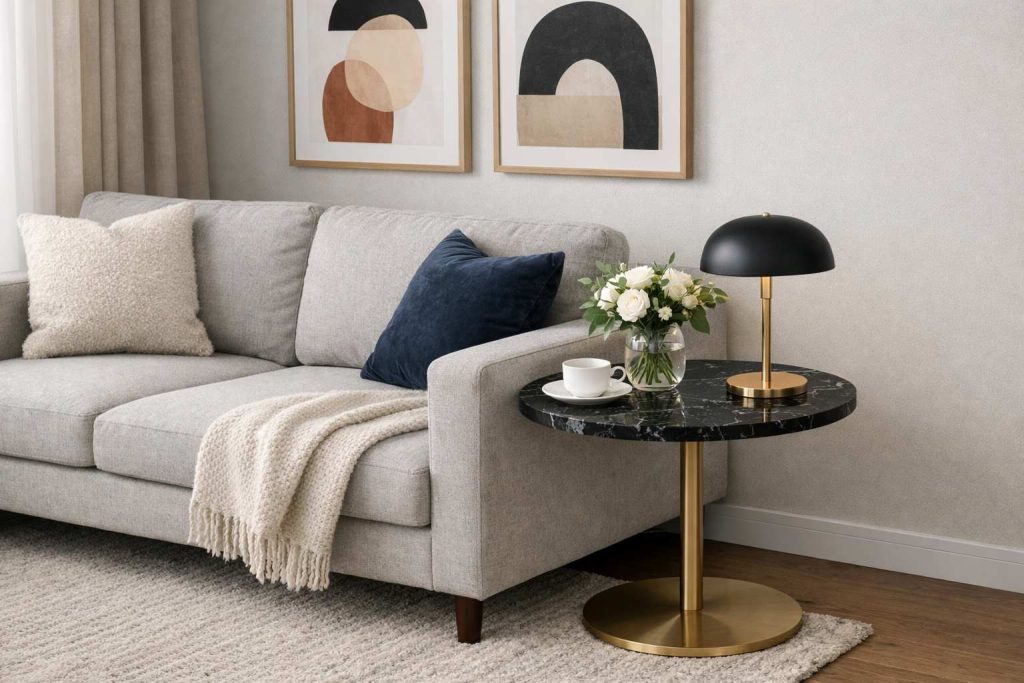 選擇邊几時,可以嘗試與大茶几不同的材質或形狀進行混搭,例如在實木大几旁放置一個金屬邊几,能增加空間的設計層次感。在小坪數設計中,輕巧且具備移動性的 C 型几或小邊几,更能取代大茶几,提升空間的使用彈性。