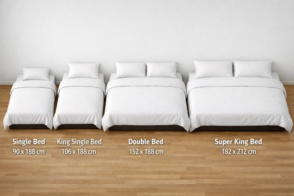 標準單人床3尺(90 x 188 cm)、加大單人床3.5尺(106 x 188 cm)、標準雙人床5(152 x 188 cm)、加大雙人床6尺(Queen Size,182 x 188 cm)以及特大雙人床7尺(King Size,182 x 212 cm)。
