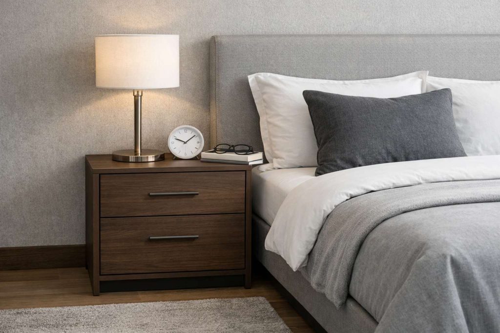 床頭櫃的高度應與床墊頂端齊平或略低 5 公分。若床頭櫃過高,不僅容易撞到頭,拿取東西也不方便;若過矮,則會讓空間顯得比例失衡。寬度通常在 40 至 60 公分,深度在 35 至 45 公分,高度約 50 至 70 公分。