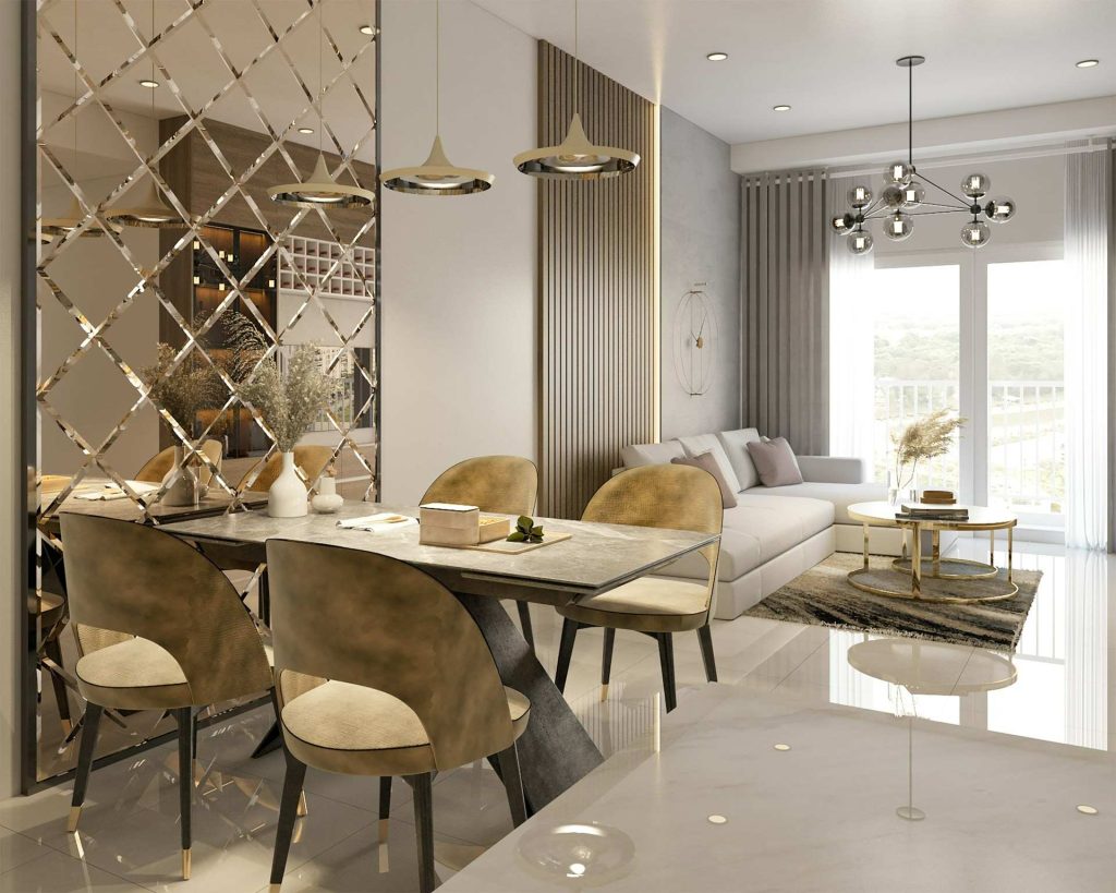 在材質方面,大理石與岩板是餐桌與地坪常見的首選,它們天然紋理優雅,且耐磨、耐高溫。金屬元素則運用於燈具、桌腳或裝飾線條,常見的色調包括香檳金、霧金與玫瑰金,能為空間增添細緻光澤。若想平衡冷調材質,可加入木紋、皮革或絲絨等溫潤質地,使整體更具人文氣息。